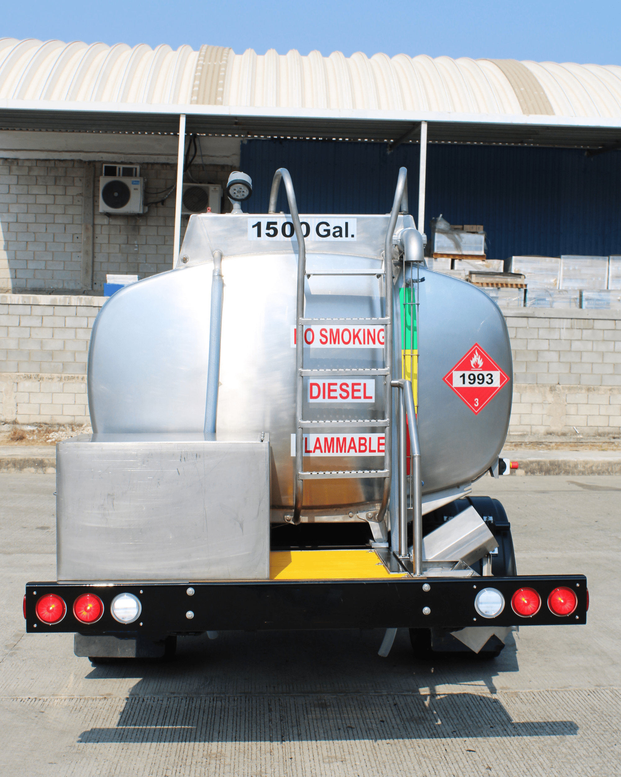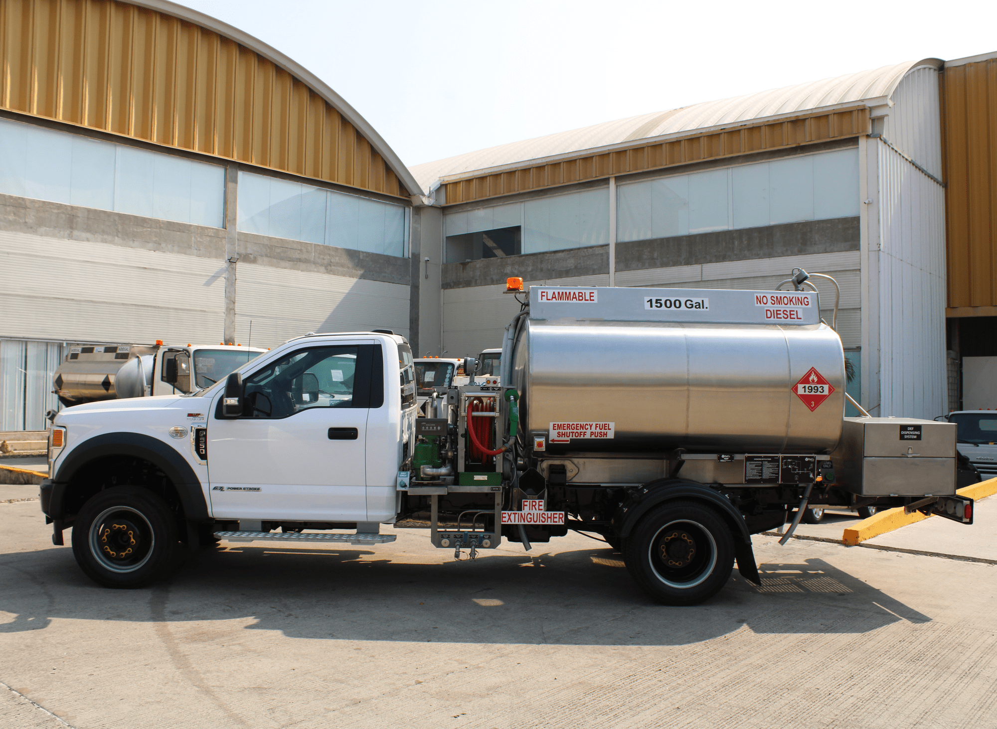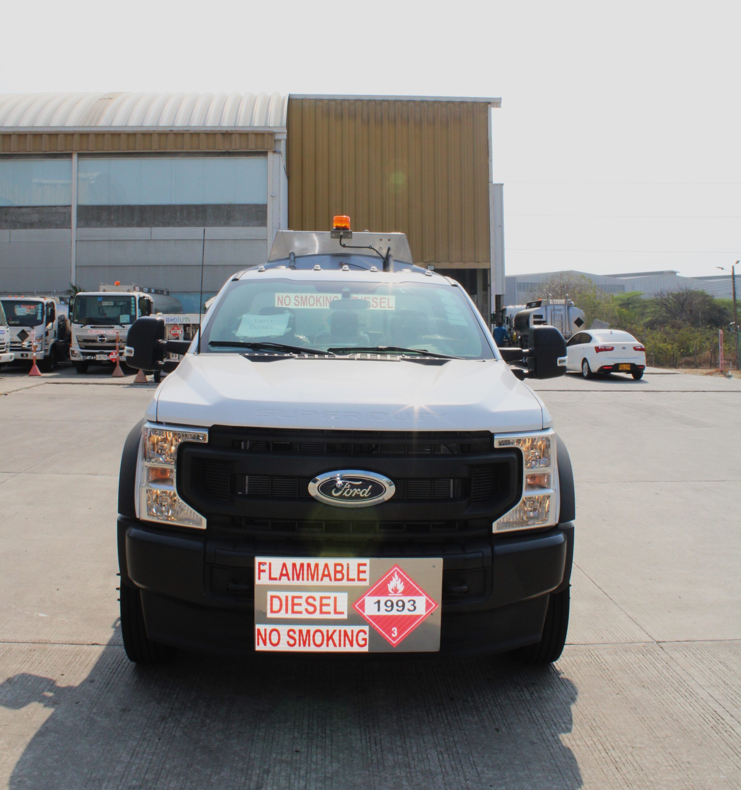 1,500 gallons (5,675 Liter) diesel refueler, built on Ford F550 4×4 Chassis, with gasoline engine, automatic transmission, and 1,500-gallon stainless steel tank. Meets all requirements of DOT 406 specifications.
