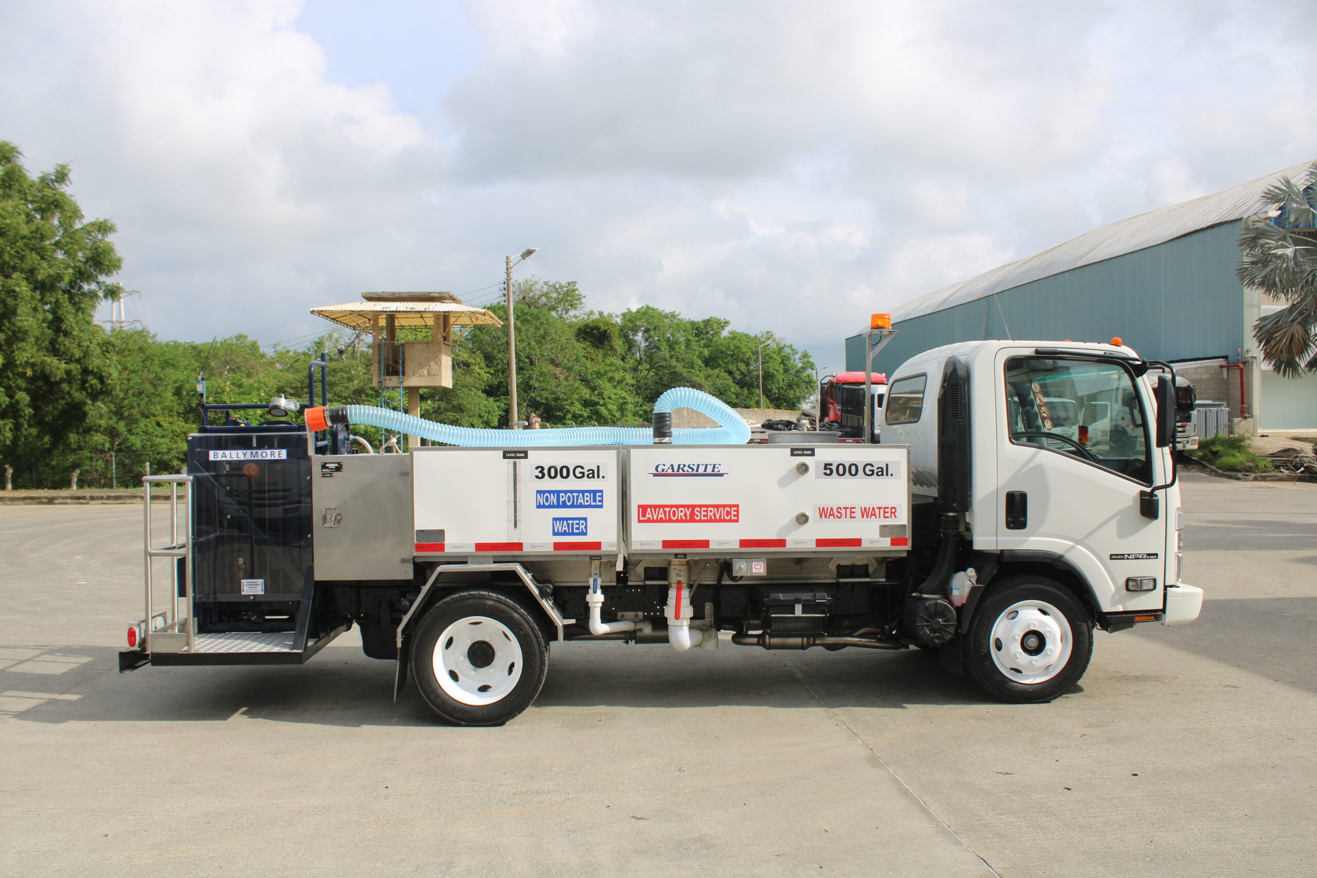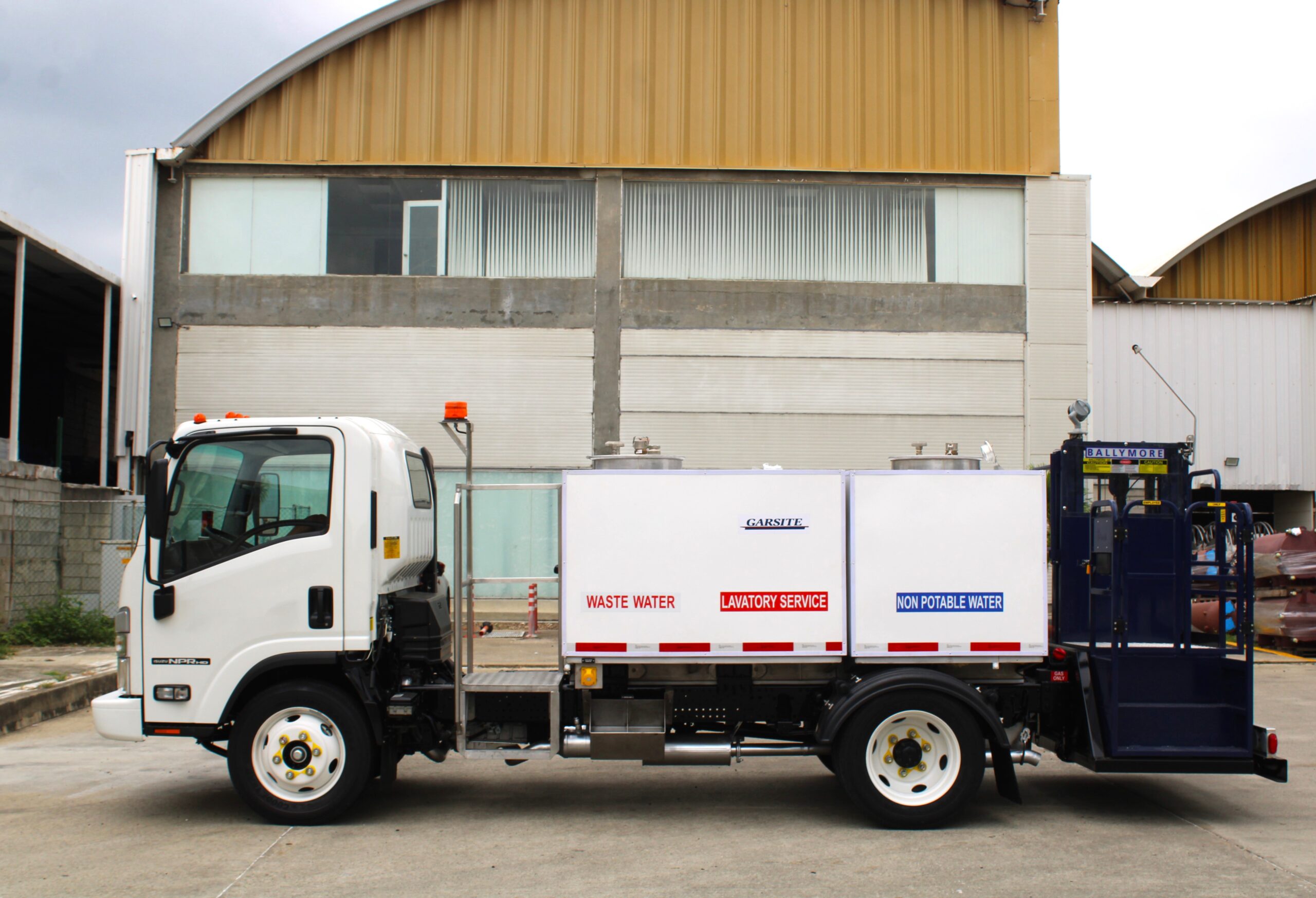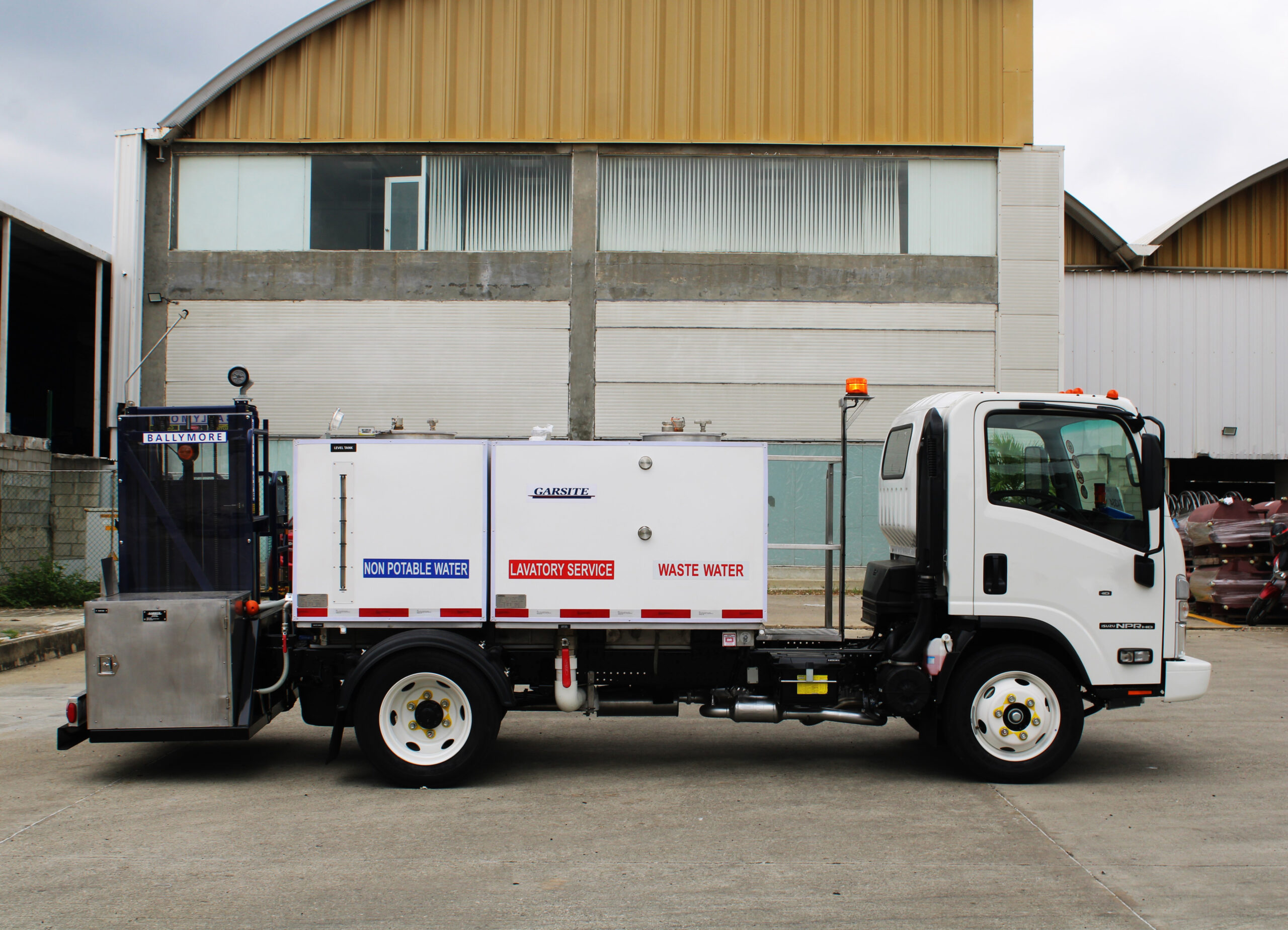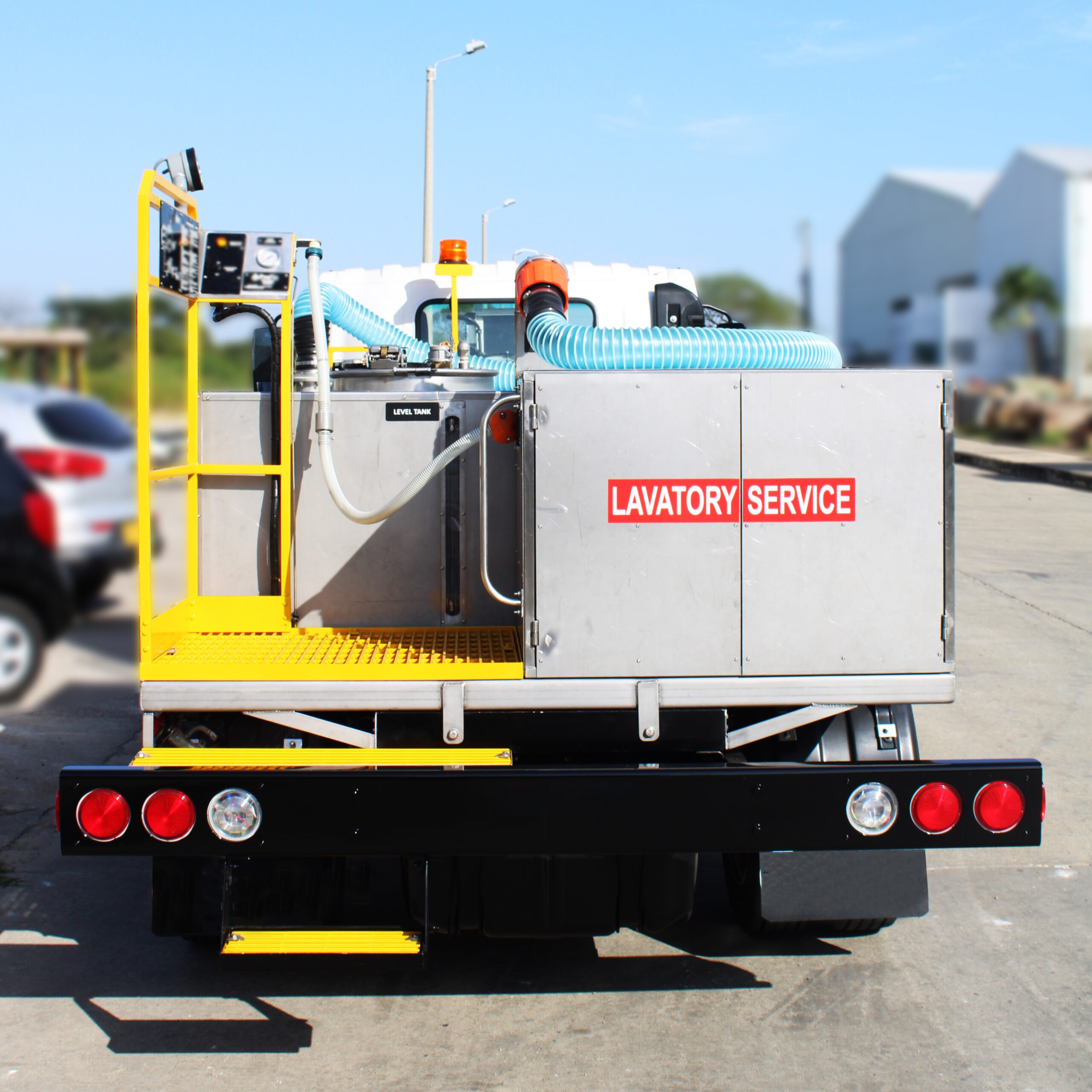 FEATURES: The lavatory water truck options include gas engine, automatic transmission with diesel engine optional, fire suppression system, range of 800-Gallon (3,000 Liter) to 1,000 Gallon (3,785 Liter) tank constructed from 304 SS Tank with Dual Compartments for Fresh Water and Waste (Single compartment for water truck), cold weather package, hydraulically driven 2″ pacer pump, Fillrite mechanical meter and register with digital meter optional, fixed platform with hydraulic platform for widebody servicing optional and fill hose.