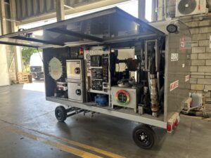 Single Wrap Underwing hose reel w/ 2.5” x 50 Ft capacity, electric rewind, and manual crank